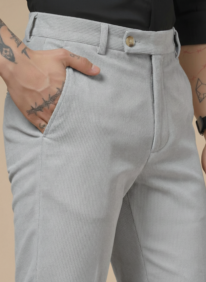 Light Grey Corduroy Men Pleated Formal Pants | Boot Cut Fit by ITALIAN VEGA®